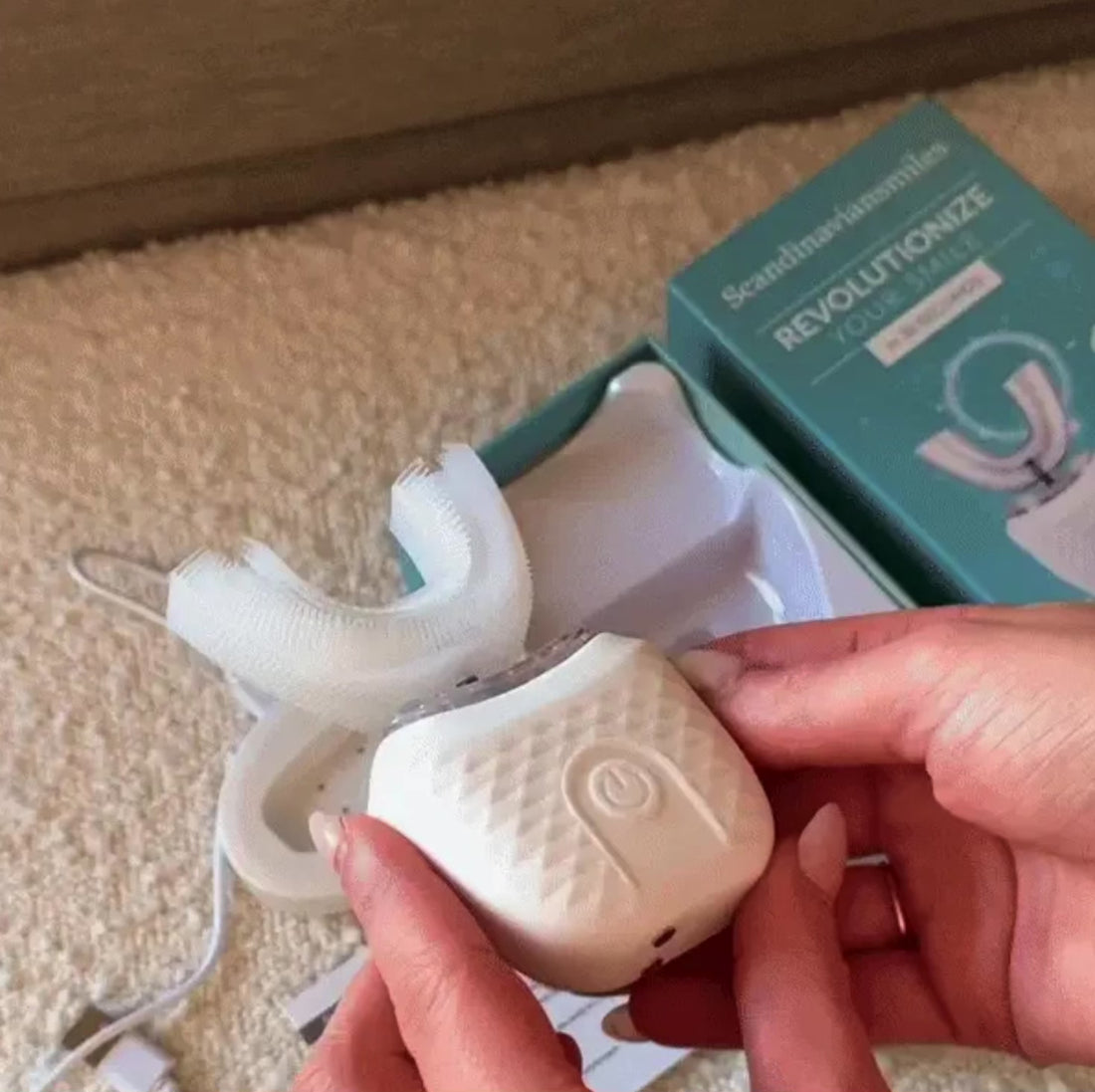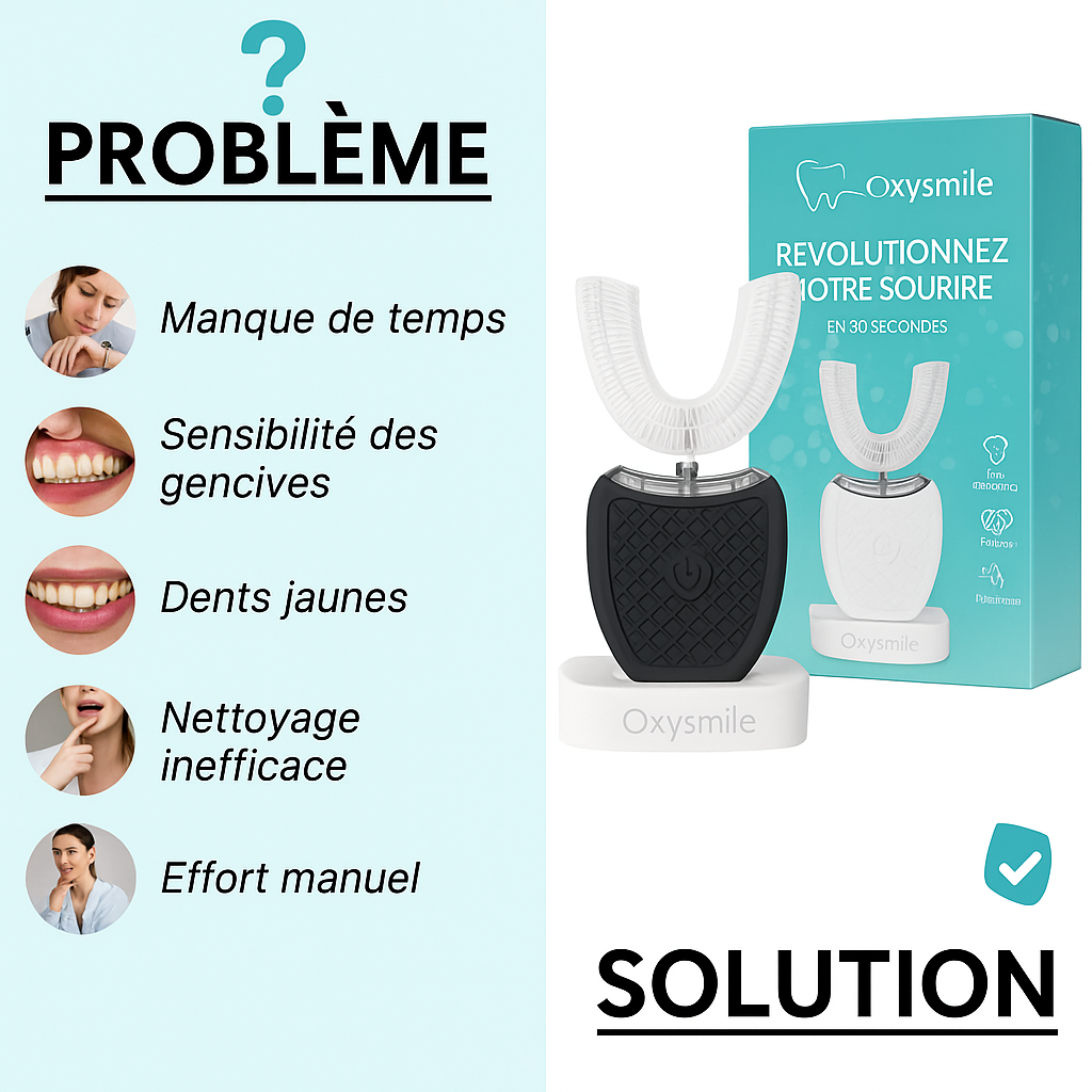 Transforme ta routine d’hygiène bucco-dentaire avec cette brosse à dents automatique en forme de U. Grâce à sa technologie sonique haute fréquence et sa lumière bleue LED, elle nettoie à 360°, élimine 99,99 % des bactéries et blanchit naturellement les dents.